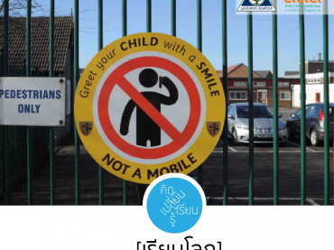 โรงเรียนประถม St Joseph’s RC ในเมือง Middlesbrough ประเทศอังกฤษ ติดป้ายเตือนพ่อแม่ที่ง่วนอยู่กับโทรศัพท์ขณะมารับลูกให้เปลี่ยนมาทักทายลูกๆ ด้วยรอยยิ้มแทน